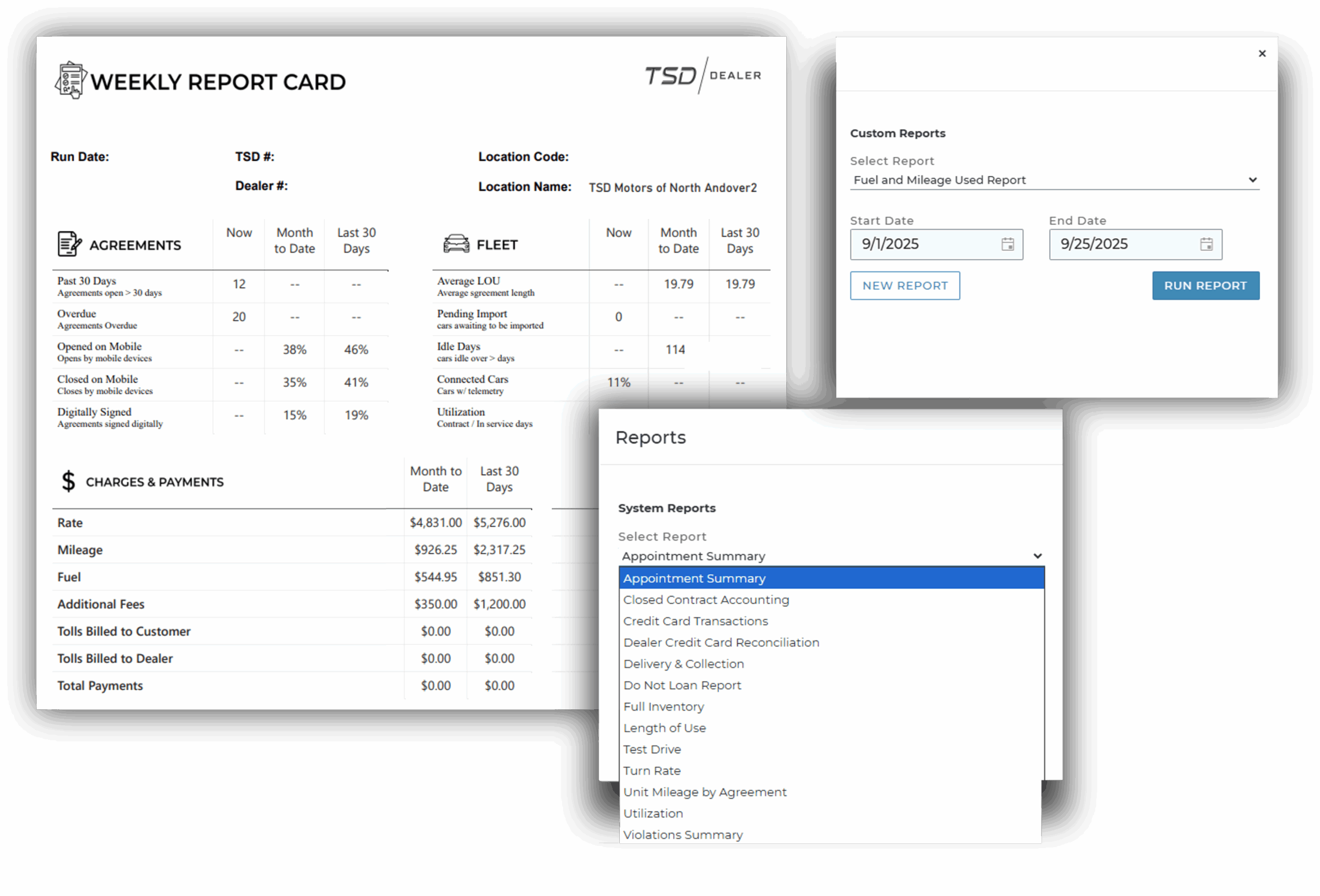 TSD offers 60+ prebuilt reports for dealerships. From standard fleet utilization reports to highly specific unit mileage by agreement reports, we have the data you need. Don’t see the report you need? Build a custom report for your dealership loaner program. TSD now offers management an automated, emailed dealer report card! See all your KPIs in one PDF.